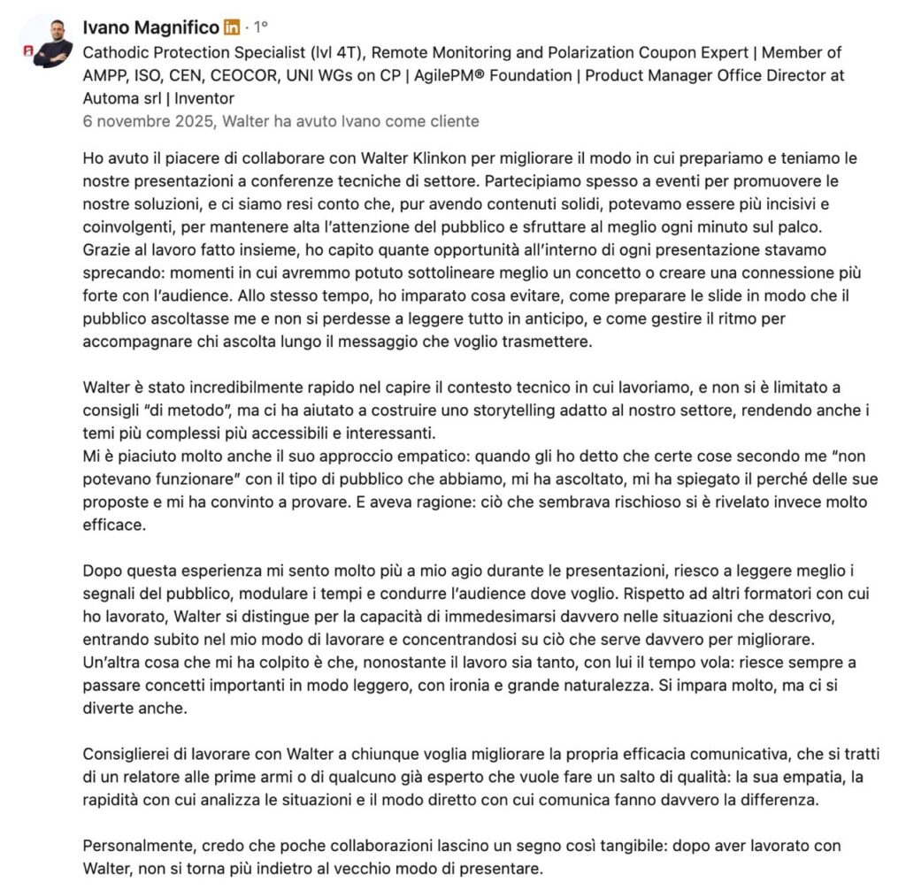 Walter Klinkon è formatore, speaker e consulente in comunicazione aziendale.